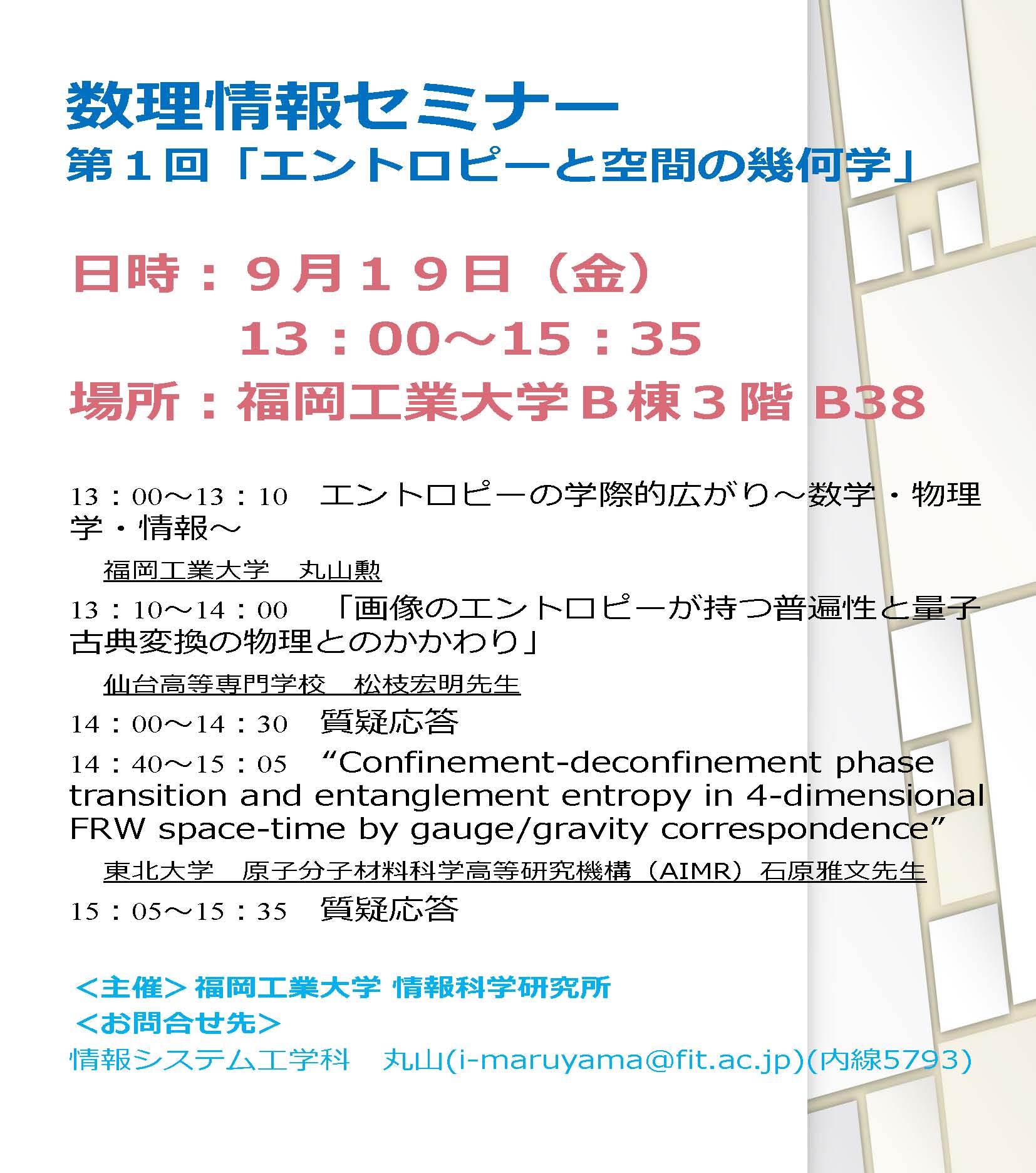 - 場所:福岡工業大学 C33講義室(C棟3階)、参加自由(最終講義を兼ねています)、連絡先:丸山