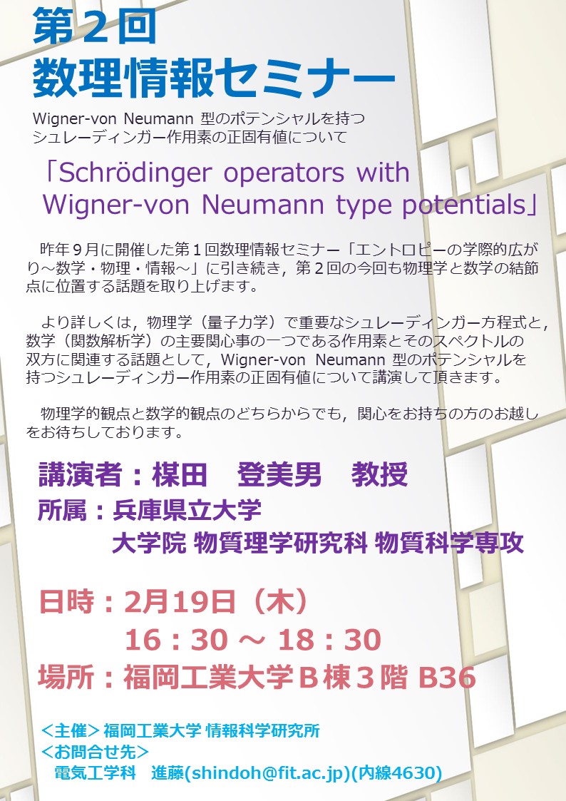 昨年9月に開催した第1回数理情報セミナー「エントロピーの学際的 広がり~数学・物理・情報~」に引き続き、第2回の今回も物理学と 数学の結節点に位置する話題を取り上げます。 より詳しくは、物理学(量子力学)で重要なシュレーディンガー方程式と、 数学(関数解析学)の主要関心事の一つである作用素とそのスペクトルの 双方に関連する話題として、Wigner-von Neumann 型のポテンシャルを 持つシュレーディンガー作用素の正固有値について、講演して頂きます。 物理学的観点と数学的観点のどちらからでも、関心をお持ちの方の お越しをお待ちしております。なお、本セミナーは本学情報科学研究所の 平成25・26年度の研究費により開催します。 |