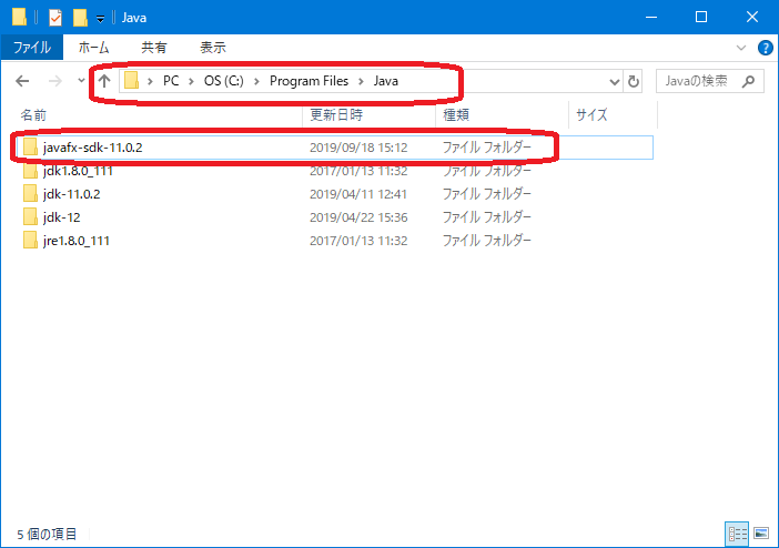 下記のフォルダjavafx-sdk-11.0.2が生成され,その中にJavaFXのライブラリファイルが入っています.