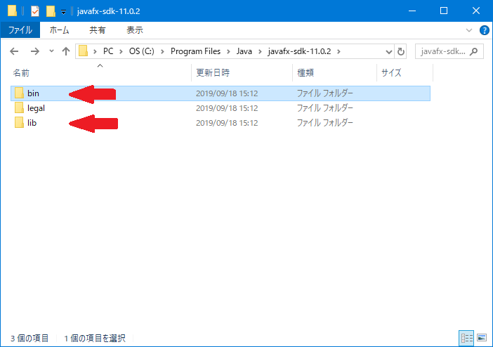 ここで,コピー先フォルダ内のbinフォルダC:\Program Files\Java\javafx-sdk-11.0.2\bin(※A)とlibフォルダC:\Program Files\Java\javafx-sdk-11.0.2\lib(※B)は次の準備で使いますのでメモしておきましょう.