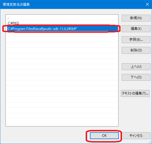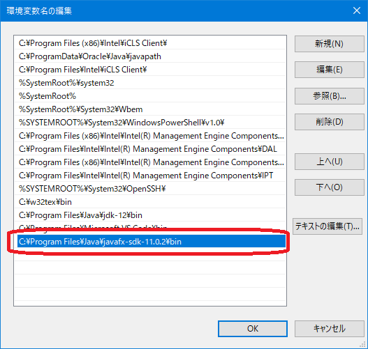 前でメモしたJavaFXのbinフォルダC:\Program Files\Java\javafx-sdk-11.0.2\bin(※A)を環境変数PATHのリストの最後に追加します.既にあるリストは削除しないでください.