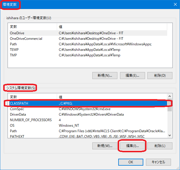 環境変数PATHの設定を行った下記のダイアログ環境変数を表示します.システム環境変数(s)欄にCLASSPATHがあるかどうかを確認してください.見つからない場合は新規(W)...を,既にある場合そのCLASSPATHを選択し編集(I)...をクリックしてください.下の図は既にある場合です.