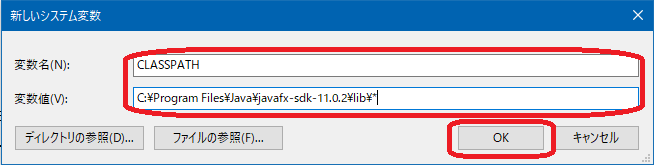 下のダイアログが表示されます.変数名にCLASSPATHを,変数値にC:\Program Files\Java\javafx-sdk-11.0.2\lib\*(※Bのメモに\*を加えたもの)をそれぞれ入力し,OKを押してください.