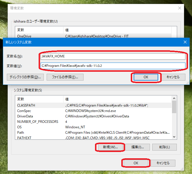 変数名にJAVAFX_HOMEを,変数値にC:\Program Files\Java\javafx-sdk-11.0.2(※Bのメモから\libを外したもの)をそれぞれ入力し,OKを押してください.