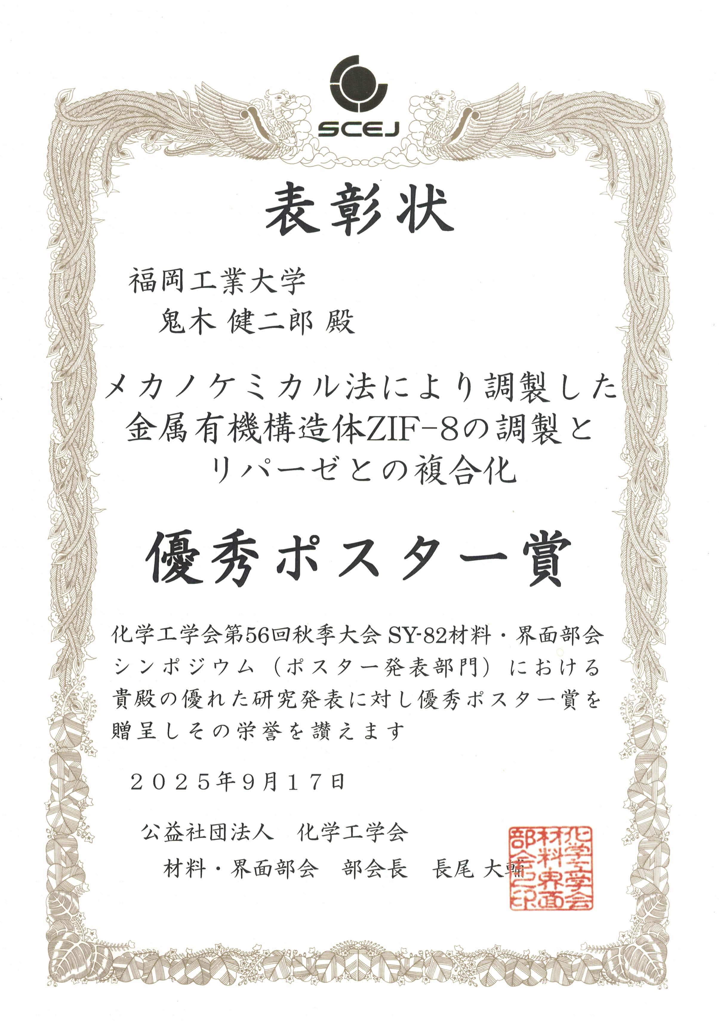 大学院生M2の鬼木君が化学工学会第56回大会(東京)にて、優秀ポスター賞を受賞しました。「テーマ名:メカノケミカル法により調製した金属有機構造体ZIF-8の調製とリパーゼとの複合化」 賞状,詳細