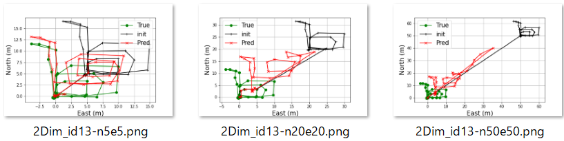 positions (left) 5 (middle) 20 (right) 50 meters north and east of the