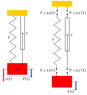 FはF = kx(t)と求められます.また,粘性ダンパの端からも, P = cx'(t)と求められる力が生じます.