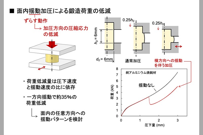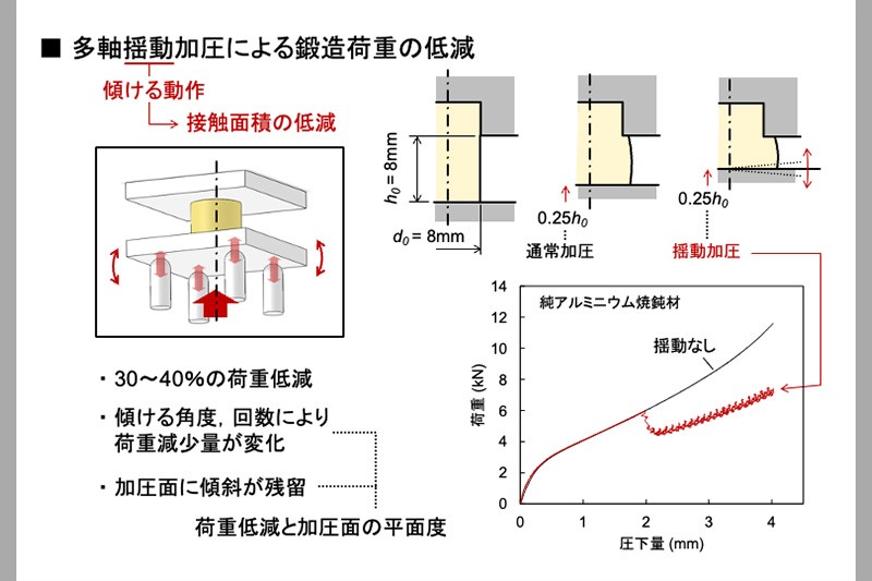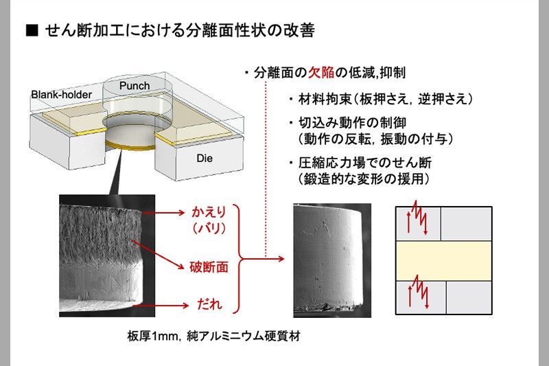 ホーム 廣田研究室 廣田研究室 教員紹介 廣田 健治 教授 研究者情報 専門 生産工学、塑性加工 所属学会 日本機械学会,日本塑性加工学会 研究室紹介 通常のせん断加工では分離面に破断面やバリなどの欠陥が生じる。本研究室では、二機の直動アクチュエータにより被加工材を挟み付けた状態で上下に様々な工具動作を与えられるプレス機を試作し、良好な分離面を得られるせん断工法の開発を行っている。 本研究室では、複数の直動アクチュエータの昇降動作を制御して、工具をフレキシブルに傾斜させながら加圧を行う多軸揺動加圧鍛造を提案している。工具との接触面積を減らすことで鍛造荷重を低減しており、荷重を低減しつつ良好な加工精度が得られる揺動条件の解明を行っている。 本研究室では、加圧中に被加工材に横方向の揺動を付与する面内揺動加圧鍛造を提案している。面内揺動により加圧方向の圧縮応力が下がることで荷重を低減しており、荷重を低減しつつ良好な加工精度が得られる揺動条件の解明を行っている。 研究室一覧に戻る