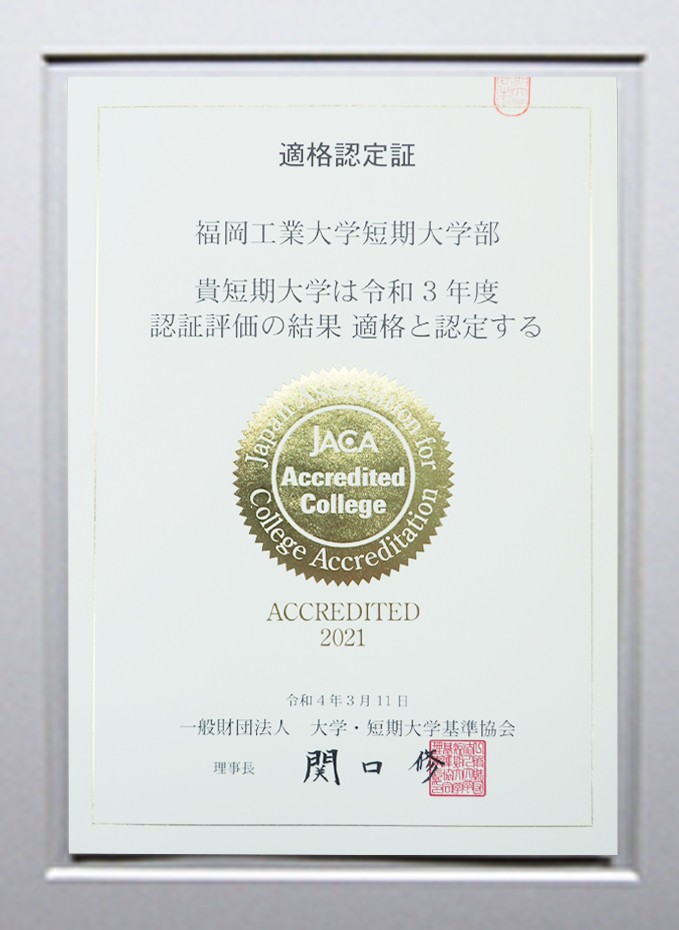 福岡工業大学短期大学部は、令和3年度、短期大学基準協会による第3期目となる第三者評価(認証評価)を受審し、『福岡工業大学短期大学部は、本協会が 定める短期大学評価基準を満たしていることから、令和4年3月11日付で適格と認める。』との評価結果をいただきました。