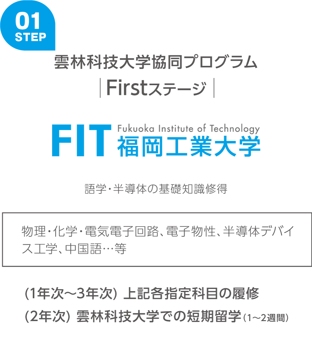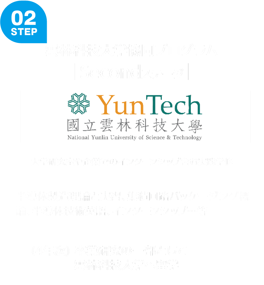 このプログラムで、福岡工業大学の学生たちは1~3年次に、福工大で半導体の基礎知識や、台湾での学修に備えた語学の修得を行います。4年次には通常履修する「卒業研究」の一部を 雲林科技大学での学修と交換。雲林科技大学の先進的な半導体教育施設で学ぶとともに、大学研究室や台湾の半導体企業でのインターンシップにも参加。 最先端の半導体技術を企業の現場で学びながら、実際の半導体業界のニーズに応じたスキルと知識を身に付けることを目指します。