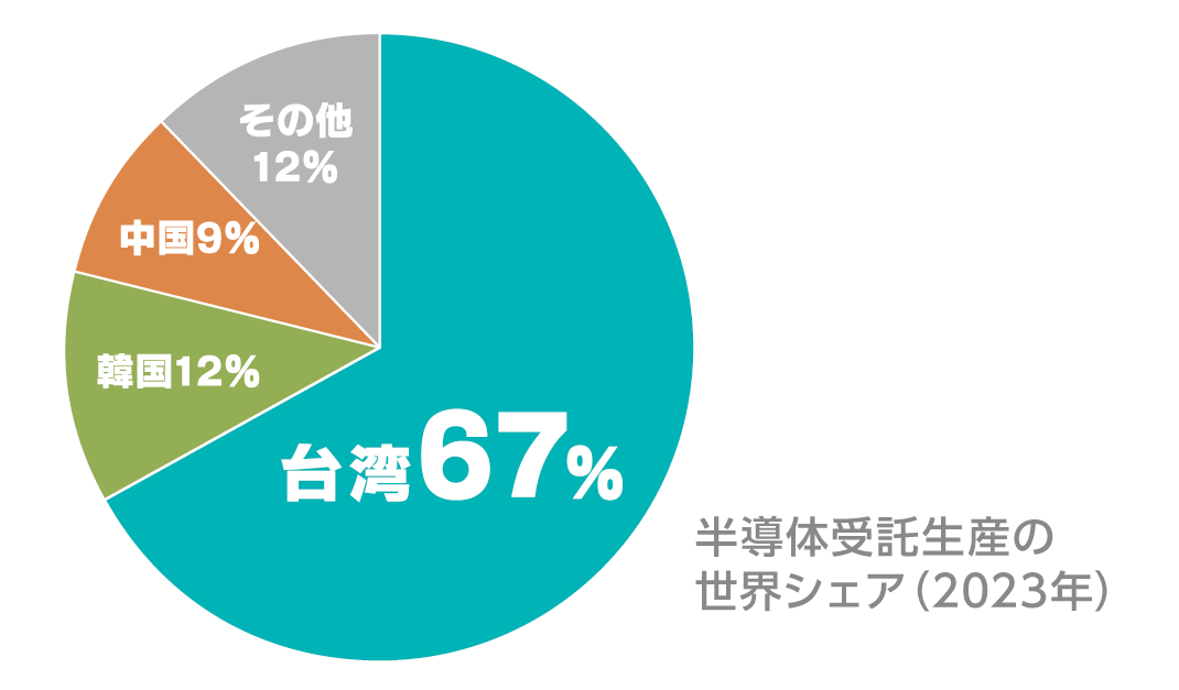 半導体の中でも特に、スマートフォンやパソコンにCPU(中央演算処理装置)などとして搭載され、電子機器の「頭脳」の役割を担う、「ロジック半導体」の生産は台湾が世界トップシェアの6割以上を占めます。世界最大の生産会社であるTSMCのほか有力なメーカーが数多く台湾に立地しています。