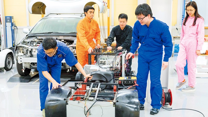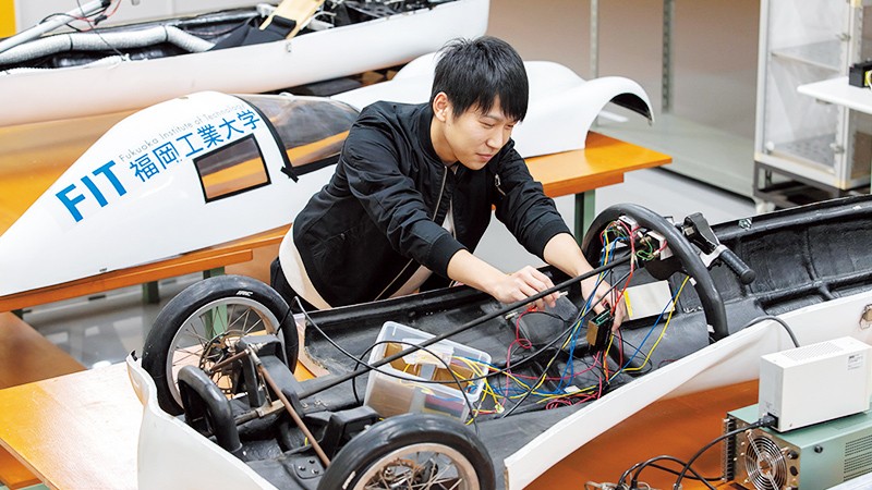 キットによる一人乗り電気自動車(EV)の設計製作に取り組むことで、エンジニアリングデザイン能力を習得します。2年次の「エンジニアリングデザインI」の授業でモノづくりを設計から学び、3年次のこの授業で実際にEVの製作を行い、全国大会のレースに参戦。設計・実践を通して創造力を育み、グループ学習を通して対人関係能力やチーム力を身につけます。