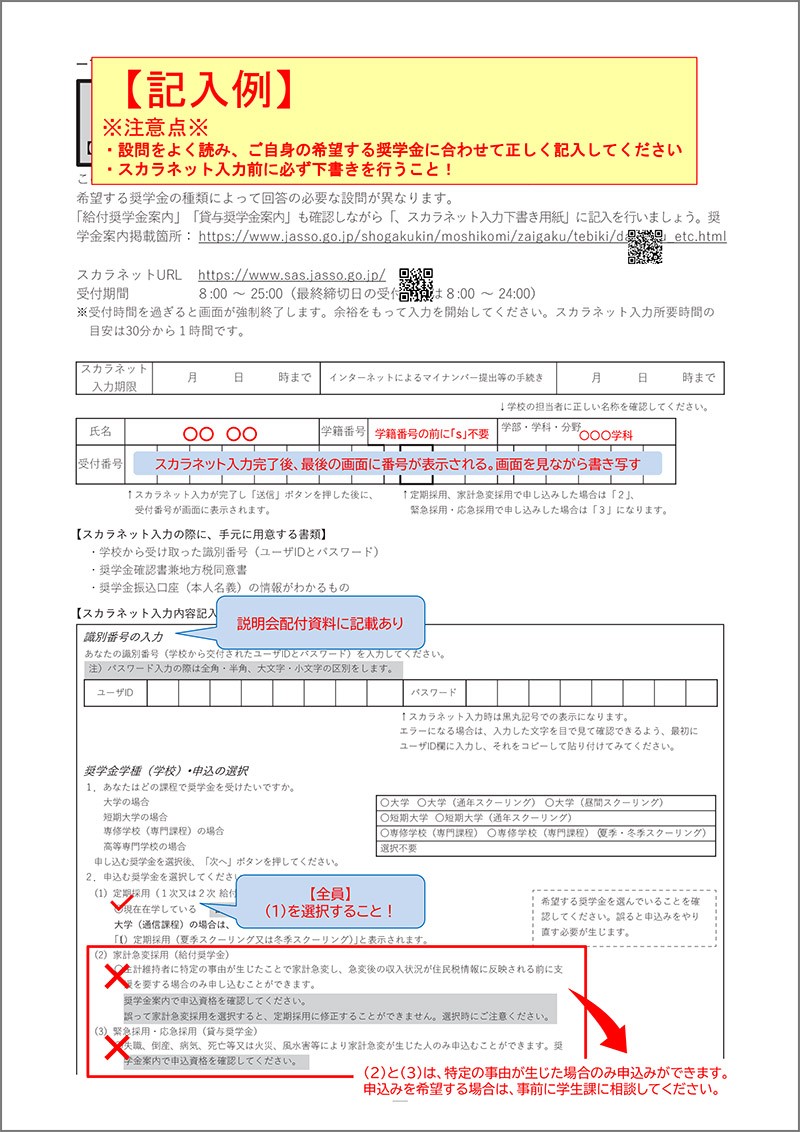 - 奨学金は学生本人に貸与・給付されます。奨学生としての自覚を持ち、提出書類など手続きも保護者ではなく、学生本人が理解したうえで準備してください。