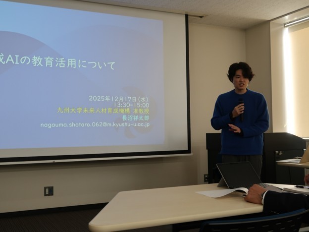 12月17日(水)に、2025年度教養力育成センター第3回FD研修会が開催されました。九州大学未来人材育成機構の長沼祥太郎先生により「生成AIの教育活用について」というタイトルのもと、教育現場における生成AI使用の現状や可能性、問題点など様々な視点からお話をしていただきました。