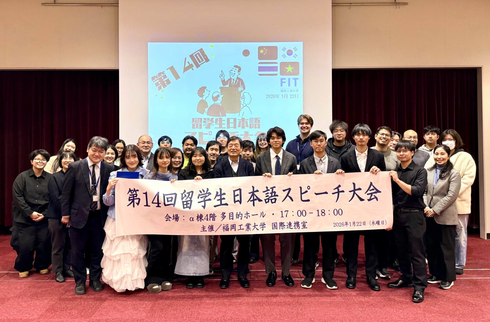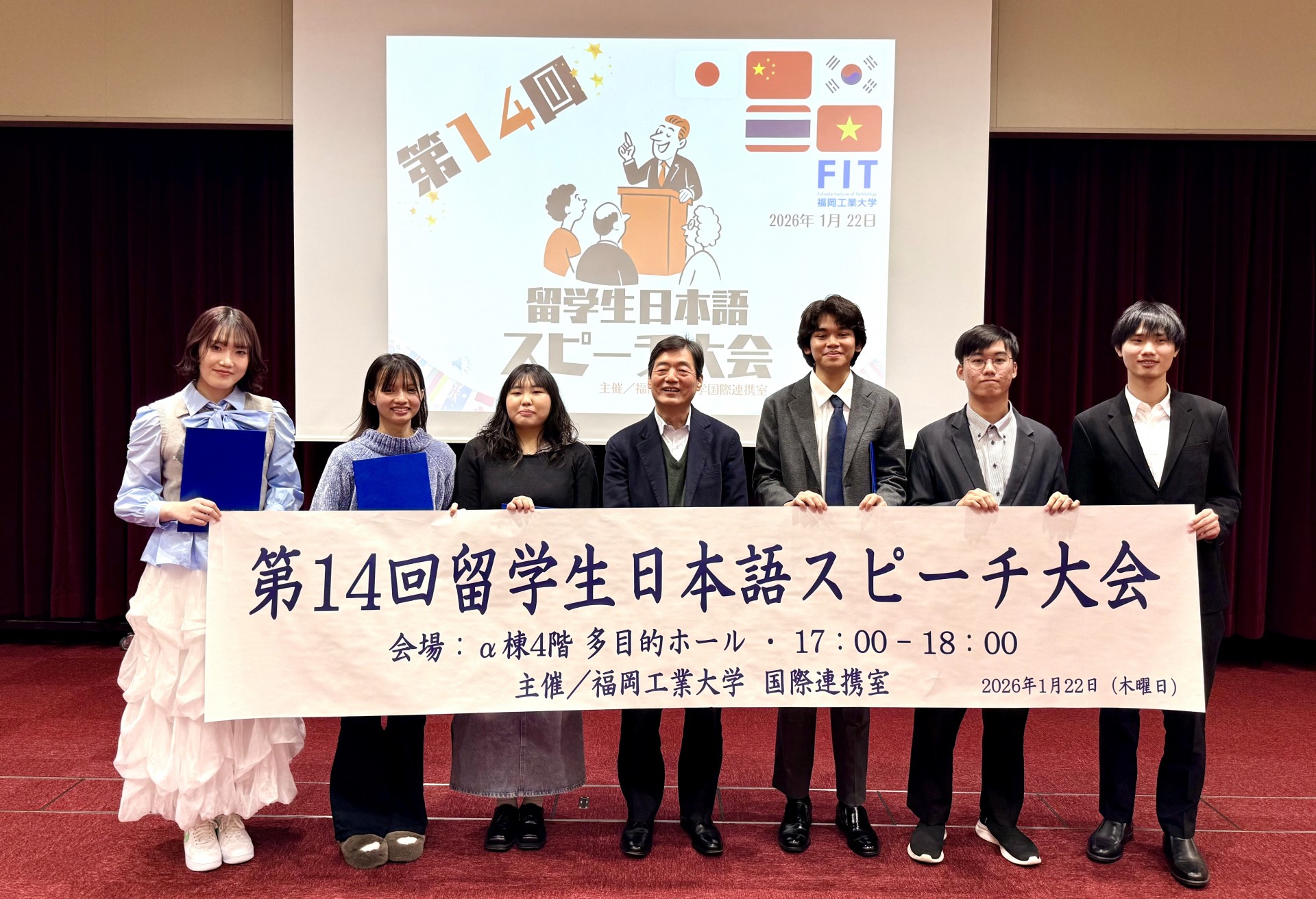 本学にも留学生別科が設立されると共に、海外協定校も増え、留学生の出身地域もより広がってまいりました。留学生の受け入れと送り出しの活性化を通して、学内は一層グローバル化し、活気に満ちてきています。そのような中、日本語学習で忙しい日々を送っている留学生のみなさんが丹念な準備を経て本大会に備えた様子は、手に取るように伝わってきました。どの発表も非常に興味深く拝聴し、日本体験の中で感じた思いが素直に語られていると思いました。母国とは異なる福岡での生活には苦労も多いでしょうが、明るく元気にひたむきな姿勢で学び、日々確かな成長を遂げている姿に感動を覚えます。これからも弛みない歩みで夢や目標の実現に向けて、力を注いていってもらいたいです。