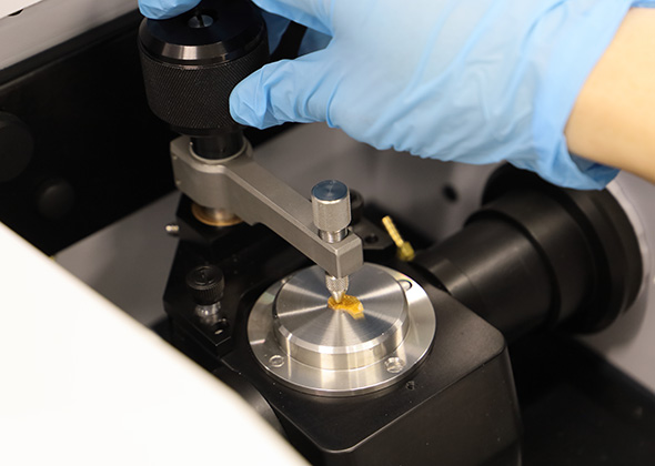 1回反射型ダイヤモンドATRを備えた赤外分光光度計(FT-IR)に、サンプルのヒドロゲル構造体をセットする(エレクトロニクス研究所内)。
