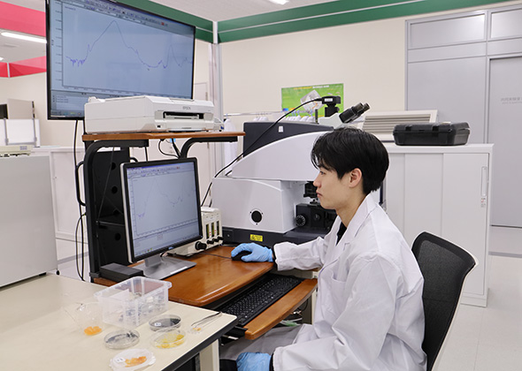 高性能のフーリエ変換赤外分光光度計(FT-IR)を用い、ヒドロゲル構造体の構造を同定する(エレクトロニクス研究所内)。