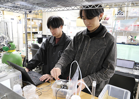 この研究室には、研究意欲の高い学生が集まっています。研究の傍らで危険物取扱者や公害防止管理者の資格試験の勉強に取り組み、資格を取得した学生も多数います。とはいえ堅苦しい研究室ではなく、室内は集中とリラックス時間のメリハリが効いた、非常に居心地の良い空間になっています。松山先生も講義や会議で忙しいなか、その合間を縫って実験法を優しく指導してくださいます。実際、研究実験はなかなか理論通りに進まないのですが、トライ&エラーを経て目的の材料ができたときは、とても感慨深く、多様な分析装置を駆使して実験を深化させるプロセスにもやりがいを感じます。また、高性能な装置の操作やデータ解析を通して座学の知識を実践的に理解できるので、自身の成長の手応えを実感できます。将来は、大学院に進学して専門性を高めた後、化学メーカーで新素材の開発に携わるエンジニアになりたいと思っています。