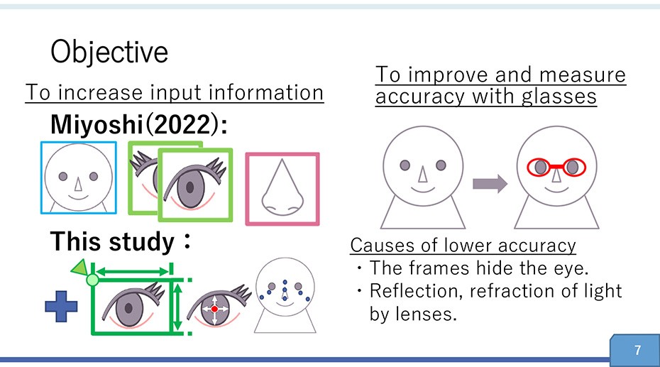 自動車事故防止研究においては、運転者の視線を計測することが重要です。松木研究室ではドライビングシミュレータ(DS)の画面上の注視点を求めるために、安価な汎用カメラ3台を用いて運転者の顔画像を撮影し、それらの顔画像から注視点を推定する畳み込みニューラルネットワーク(CNN)モデルを構築しています。機械学習により3台のカメラの画像を用いた視線推定について計測精度を向上させる手法を検討しましたが、眼鏡を着用した人物に対してはこれまで検討されていませんでした。眼鏡着用時にはレンズにおける光の反射や屈折により推定精度は悪化することが考えられます。本研究では試験的にその精度を高める推定手法を検討しました。