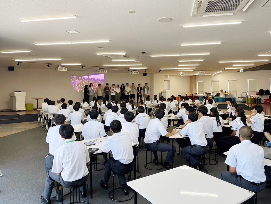 研修期間中には、城東高校の英語の授業と連携し、宜蘭大学の学生が台湾紹介や台湾と日本の類似点・相違点などについて生徒80名超の前でプレゼンテーションを行い、台湾のお菓子を試食しながら懇談しました。高校生にとっては、普段外国の方と接する機会が少ないため、異文化理解の深化や国際感覚の養成などが図れた貴重な体験となりました。