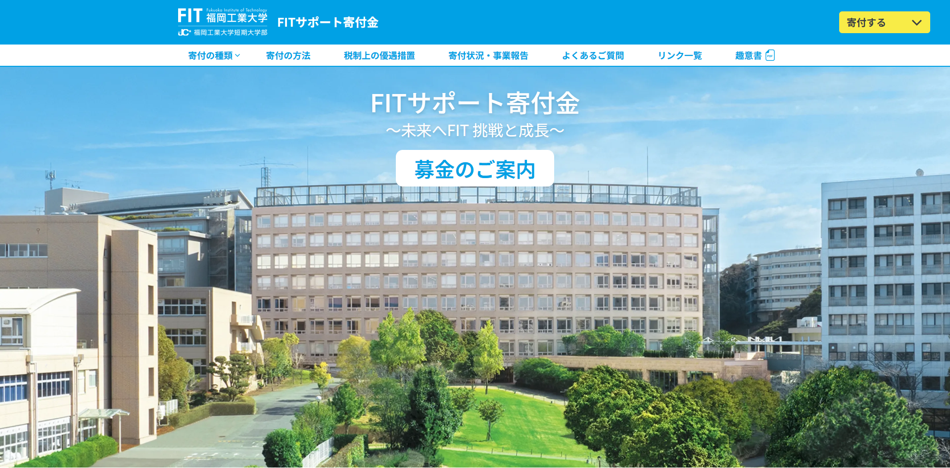 新着情報福岡工業大学 「FITサポート寄付金」募集ページを開設しました。 トピックス 2025.10.09 教育・研究環境のさらなる充実と、次世代を担う人材育成のため、寄付募集専用ページを開設いたしました。 皆さまからの温かいご支援は、学生たちの学びの場をより豊かにし、社会に貢献できる人材の育成につながります。 本学の理念にご賛同いただける皆さまからのご支援を、心よりお待ちしております。 FITサポート寄付金 Tweet 一覧に戻る TOP 新着情報 トピックス 福岡工業大学 「FITサポート寄付金」募集ページを開設しました。