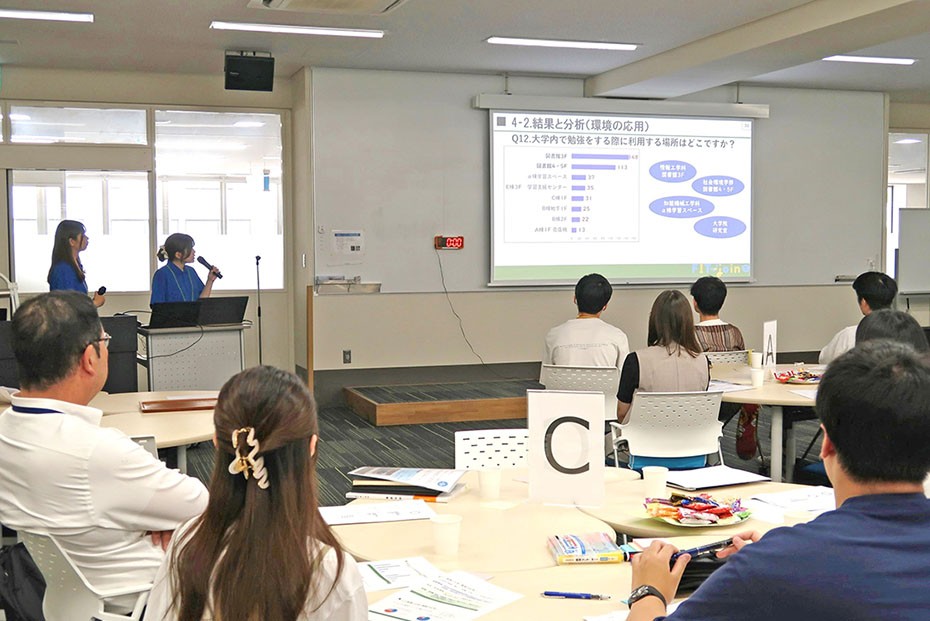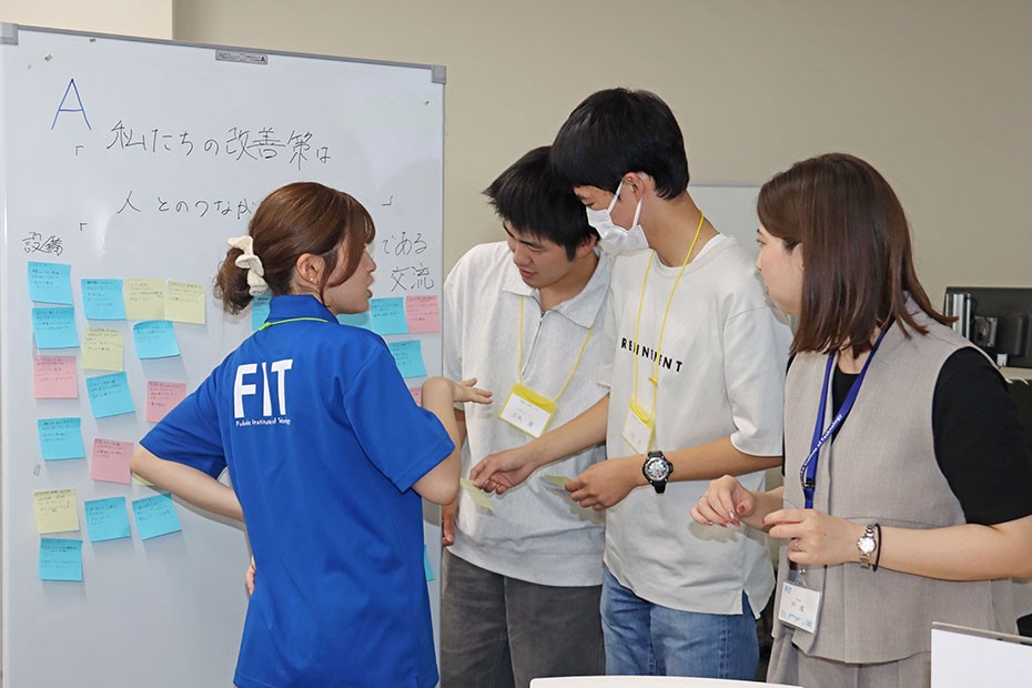 プログラムは、まず初めに学生FD FIT-joinが前期に実施した学生アンケートの報告を行い、次に情報通信工学科の松尾慶太教授のファシリテーションによるグループワークでは、大学におけるつながりをテーマにディスカッションを行い、各グループのまとめを発表しました。