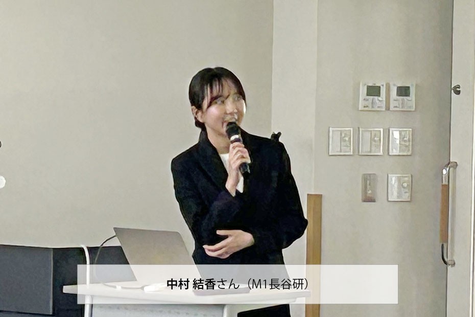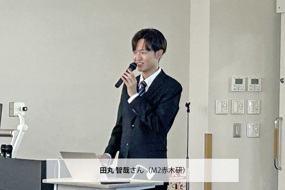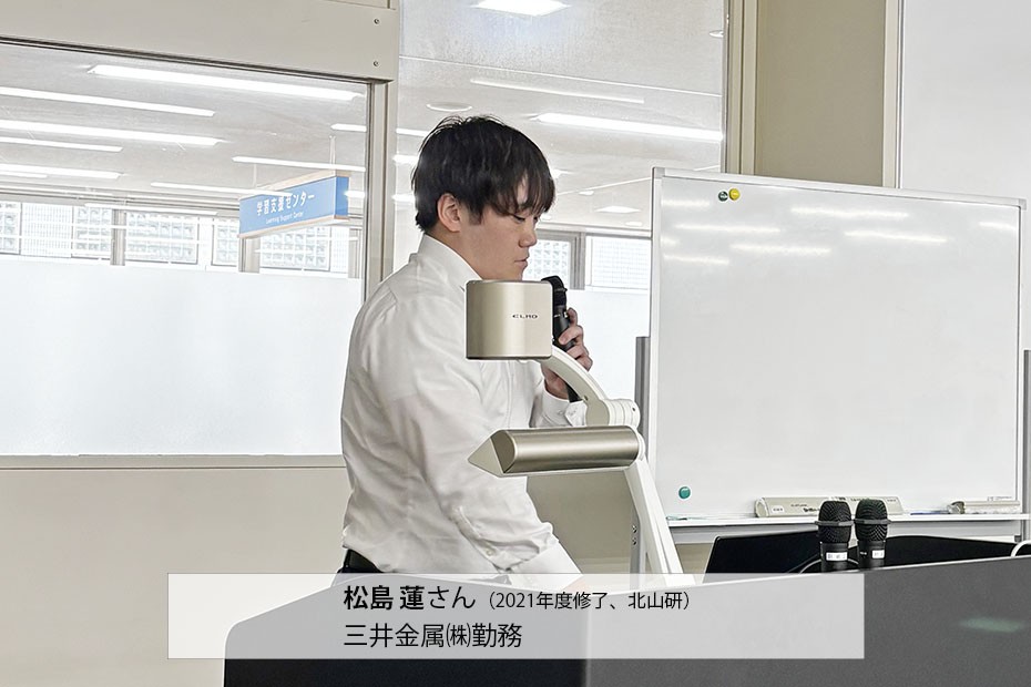 続いて、現役の大学院生の生の声として、修士2年次と1年次の学生より、進学のきっかけや大学院での生活などについて体験談がありました。さらに、2021年度の修了生から、大学院での学びが現在の仕事につながっていることの紹介がありました。
