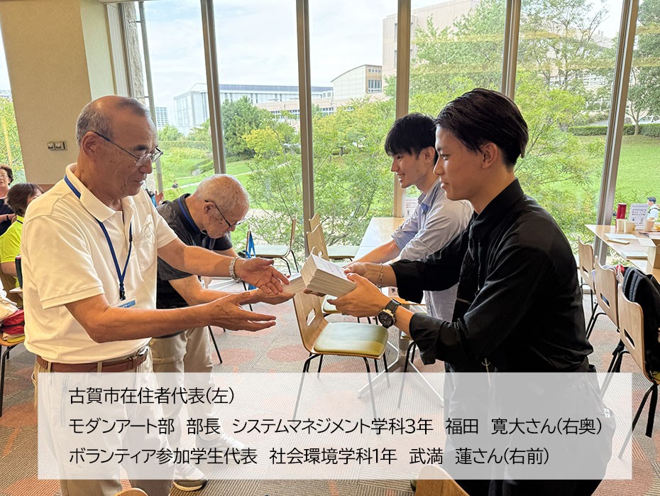 本活動には、本学のモダンアート部や吹奏楽団メンバーをはじめ69名の学生が参加しました。作成した約500枚のカードは、9月26日(金)に本学で開催された古賀市・篠栗町の住民を対象とした測定交流会中のランチ交流会において、代表学生2名(モダンアート部、ボランティア参加学生代表)より古賀市へ贈呈しました。