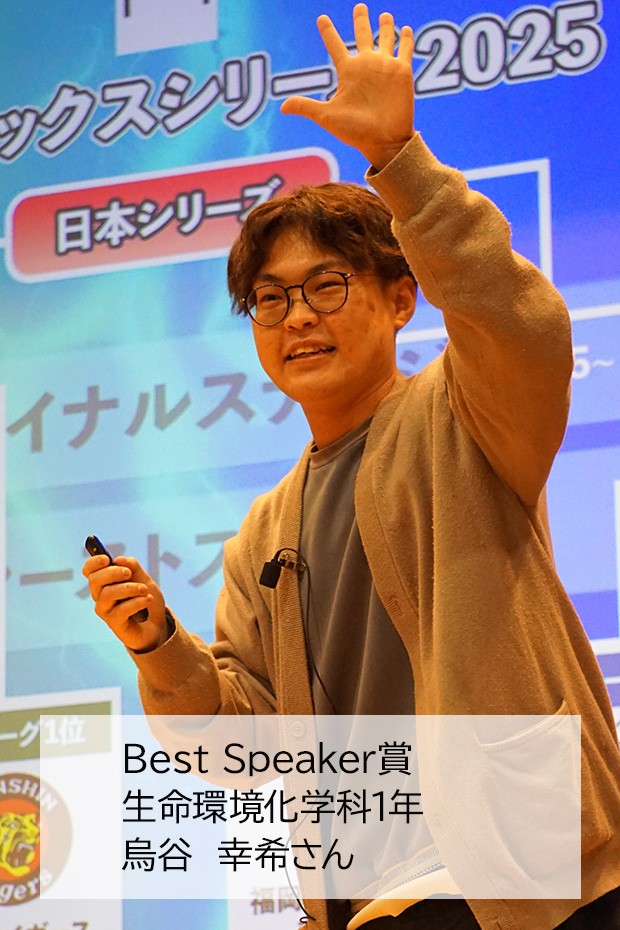 2025年12月3日(水)英語プレゼンテーションのコンテスト「第10回FIT TALKS」を開催しました。今年の参加者8名は全員中級のレベルのテーマを選び、10月から国際連携室の英語ネイティブスタッフと一緒にグループと個人レッスンを重ねてきました。FIT TALKSは英語でのプレゼンテーションを行う上での3つの重要な要素である①アイデアを論理的にまとめる能力、②英語能力、③人前で自信を持って発表する能力のそれぞれの向上を目指しています。学生生活が多忙を極める中、人前で発表することの緊張を乗り越え、参加者全員FIT TALKS の目標を見事に達成しました。
