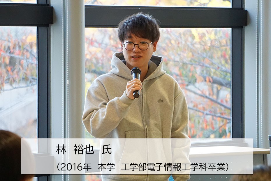 林氏からは、本学に在学中に米国カリフォルニア州で実施された4つの海外留学に参加し、初めて生体信号を扱う技術に触れたシリコンバレーでのインターンシップの経験や、卒業後、日本のスタートアップ企業で創業メンバーとして働いた経験から副業まで、一貫して脳波の研究開発に携わってきたことが語られました。さらに、多忙を極めた社会人生活の中で、体調不良となった辛い自己の経験を乗り越えて、今年9月には株式会社メルドワークスを起業したことを振り返り、「挑戦をしていく上で心がけていること」について、また、「挑戦していく上で、失敗も含めた経験の積み重ねが次の挑戦につながること」について述べられました。学生は、林氏から「失敗を失敗と捉えず、その全てを糧にする姿勢をもって挑戦しつづけることの重要性」を学び、より一層の成長に繋げるための具体的な指針をいただく機会となりました。