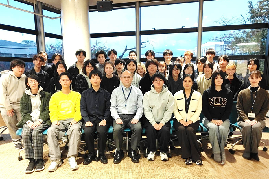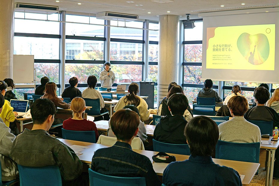 2025年11月21日(金)、グローバル人材育成を主眼に置いたGlobal Challenge Program (GCP)では、29名の学生(1年生~4年生)と教職員7名の総勢36名が出席し、林 裕也氏(工学部 電子情報工学科/2016年3月卒)による、「小さな行動が、挑戦を育てる」と題したプロフェッショナル講話を開催しました。