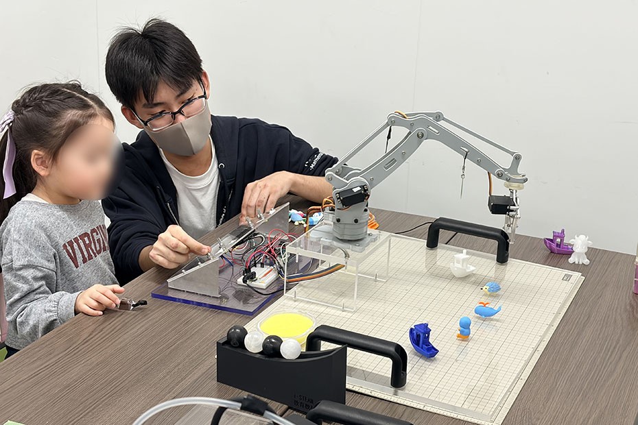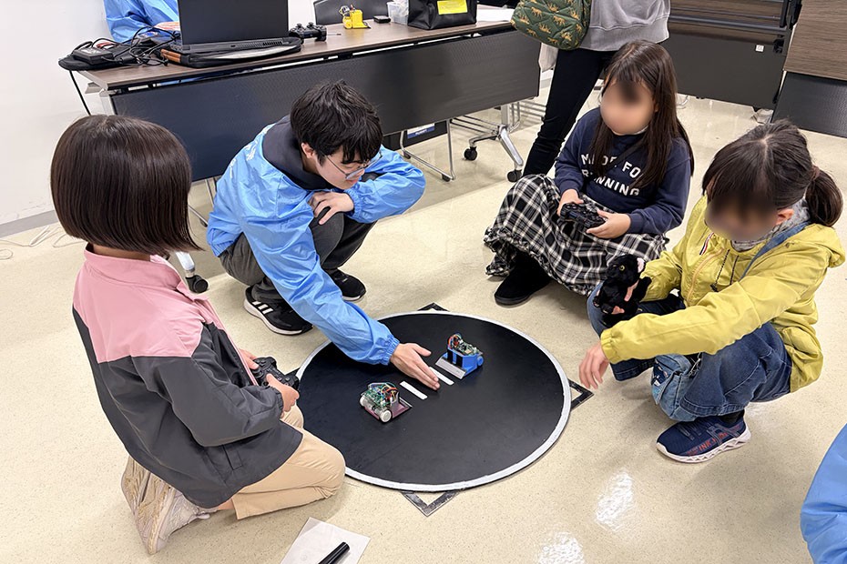 同イベントに参加するのは本年で3回目となります。当日は手作りアクセサリープロジェクトの制作体験「キラキラ☆レジンキーホルダーを作ろう!」、また操作体験として、ロボット相撲プロジェクトの「ロボット相撲を操作しよう!」、i-STEAM教育教材開発プロジェクトと情報システム工学科下戸研究室の「エアホッケーロボットを操縦して対戦」「3輪ロボットを操作してサッカー対戦」「アームロボットでお菓子を掴もう!」が行われました。