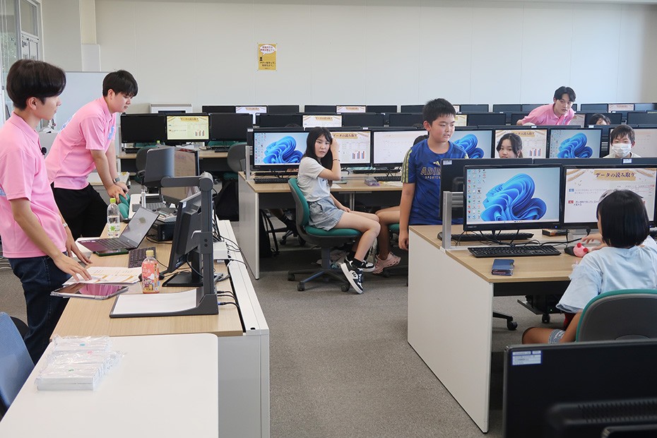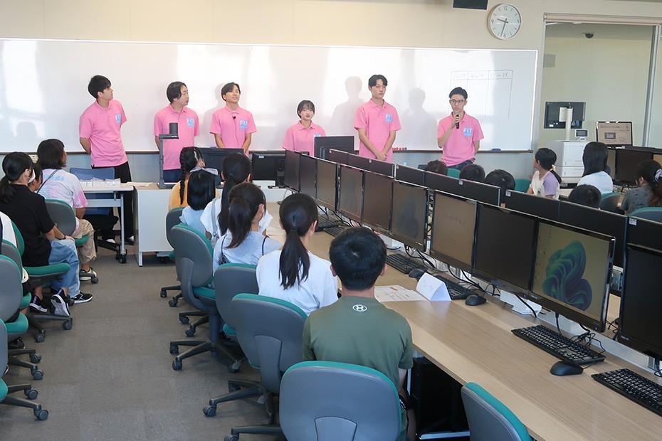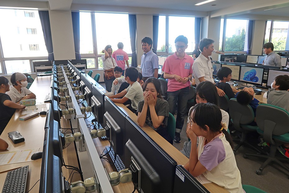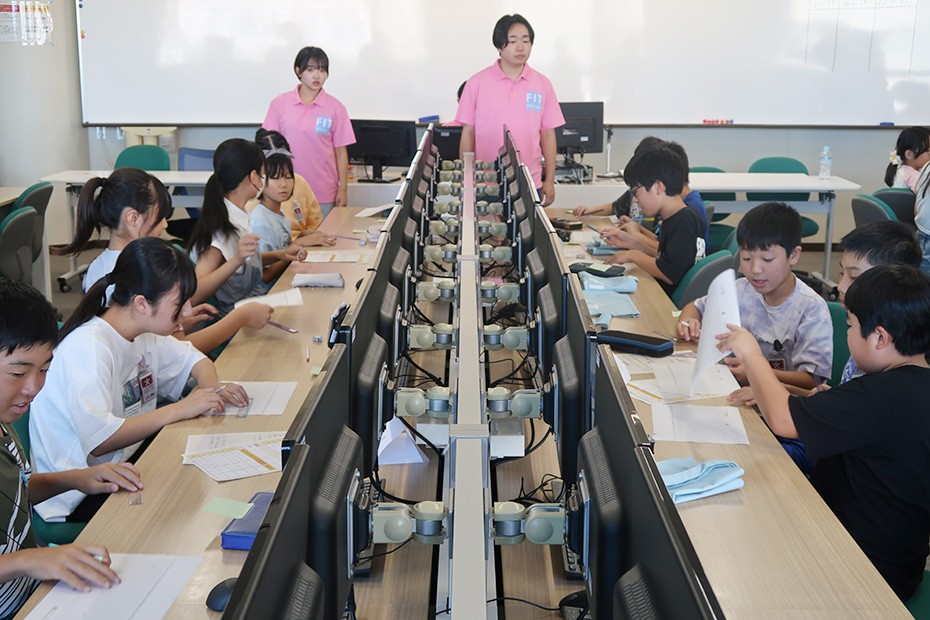 情報工学部システムマネジメント学科※3年の井口研究室では、包括的連携協定を締結している新宮町と連携して「小学校ICT体験授業」に取組んでいます。この取組みは2017年より実施しており、今年は新宮町から2校、計29名の児童が参加しました。「ベーカリーゲーム」と「あみだくじの秘密」の2テーマで授業を行い、ICTの重要性を伝えつつ、児童たちが楽しみながら学べるよう工夫しました。その後、大学の施設見学やモノづくり体験等のプログラムも行われました。