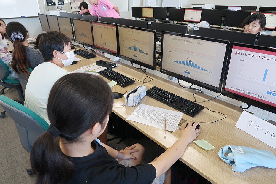 まずはあみだくじを児童29人で29通り行い、その後、シミュレーターで試行回数を 増やし、どのような傾向になるか学習しました。中には、数万回試行した児童も!