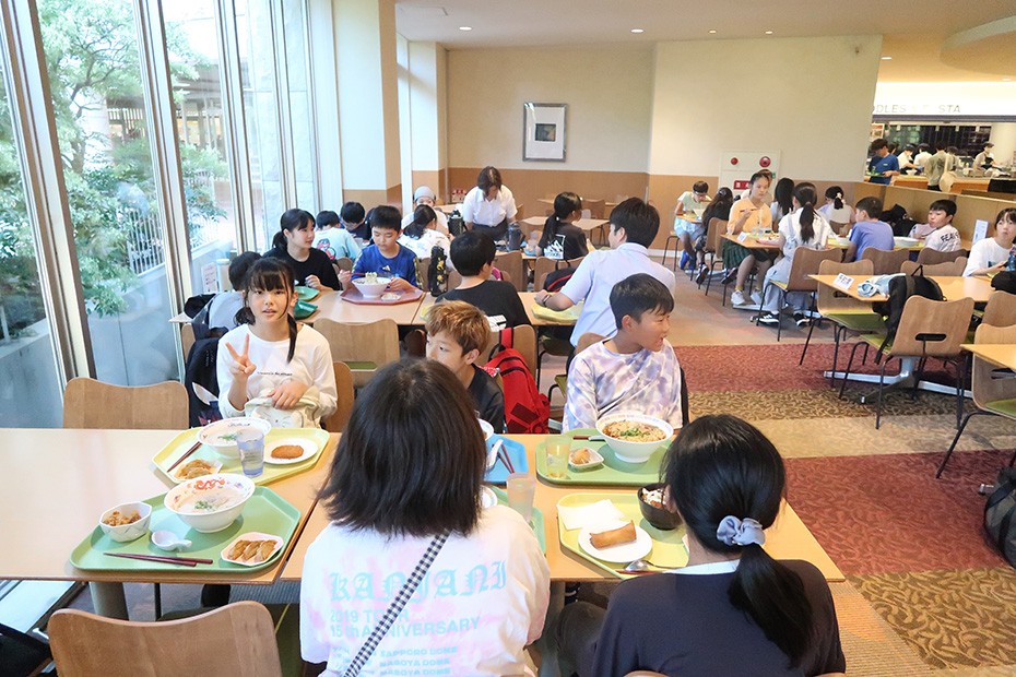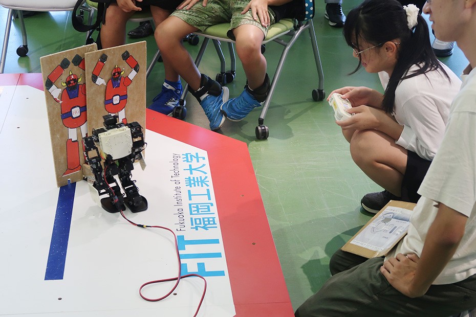 学食体験の後、立花小学校の児童はモノづくりセンターで二足歩行ロボットプロジェクトの学生から説明を受けてロボット操作を見学、相島小学校の児童は学内施設を見学後、モノづくりセンターでのロボット操作を体験しました。