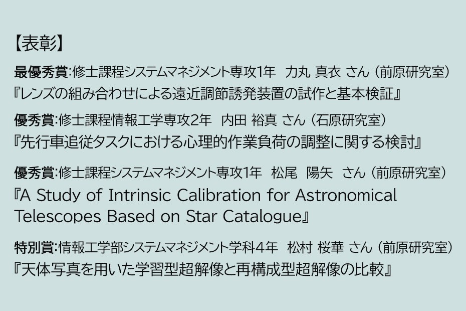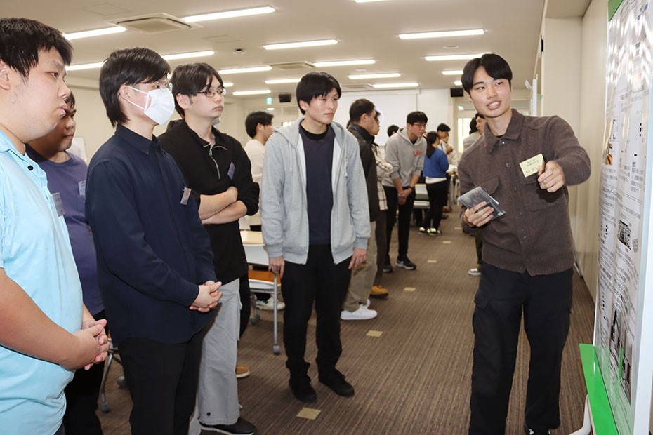 本交流会には、工学部と情報工学部の9つの研究室が参加し、大学院生および学部生が、ポスター発表形式により日頃の研究成果を紹介しました。さらに、教員も交えた活発な議論が行われ、異なる分野の視点を取り入れた質疑応答は、学生にとって新たな気づきや視野の拡大につながる貴重な機会となりました。参加者からは、「ポスター形式は議論が盛り上がり、色んな分野の研究が聞けててよかったです。」、「貴重な機会に参加できてよかったです。」といった感想が寄せられ、学内での研究交流の重要性が改めて認識されました。研究発表後にはFIT BBQにて懇親会が開催され、研究の枠を超えたリラックスした交流の場となるとともに、教職員の投票により優れたポスター発表に最優秀賞、優秀賞、特別賞が授与されました。