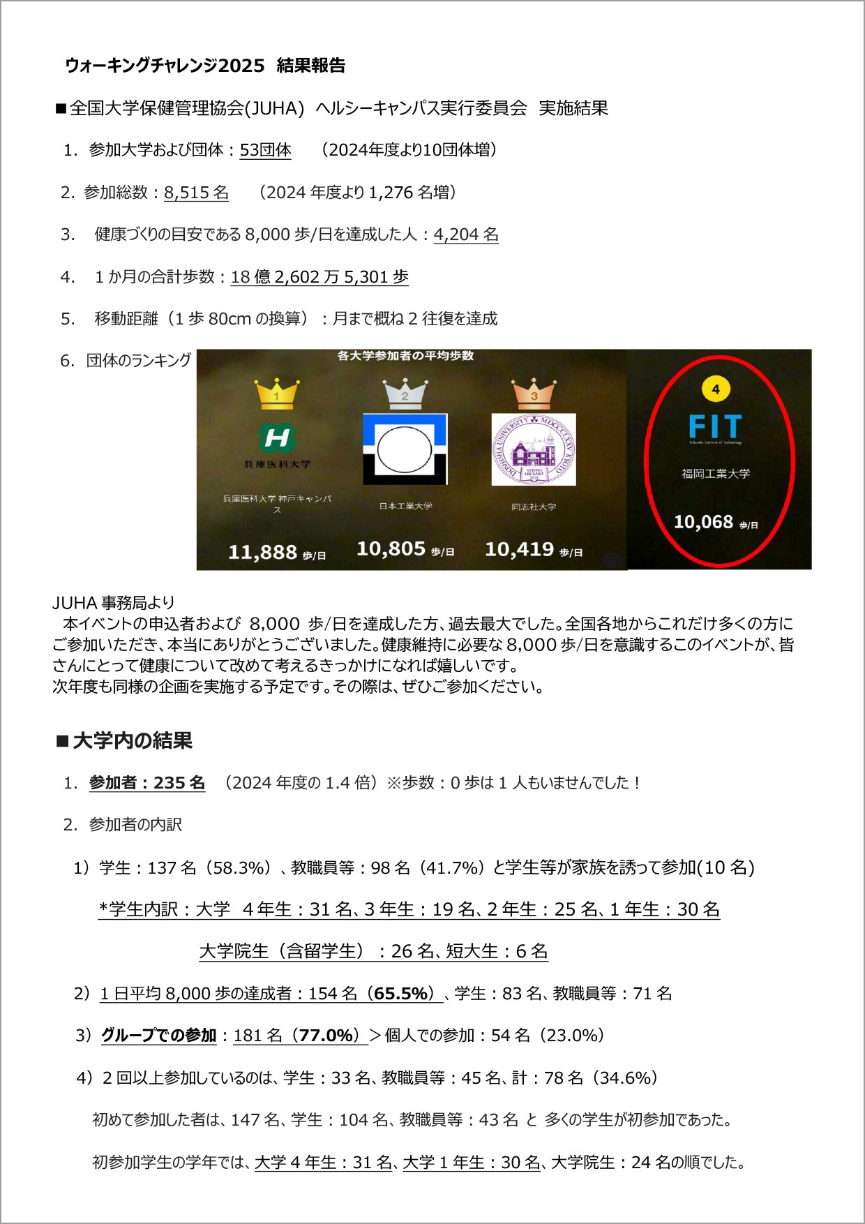 今年度で 4 回目を迎えたウォーキングチャレンジ 2025。参加者も本学で 235 名と昨年度の 1.4 倍 全国では、8,515 名(昨年度の 1.2 倍)と多くの方で、月まで概ね 2 往復を達成しました。