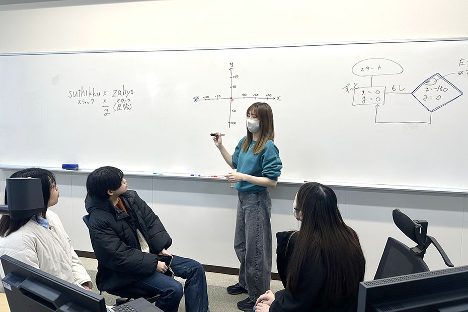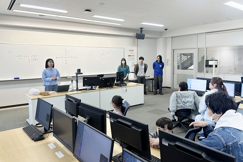 FIT女子会は、「憧れのキャンパスづくり」を目指し、女子学生自身が企画・提案・実行を行う学生団体です。今回は、「地域の方に大学をより身近に感じてほしい」「小学生に理系分野に興味を持ってもらいたい」という思いからこの教室を企画し、自分たちが学ぶプログラミングをどうすれば小学生に分かりやすく伝えられるか、試行錯誤を重ねながら準備を進めました。また、本学公認の部活動である情報技術研究部の学生の協力も得て、講義用レジュメや進行台本も学生主体で作成しました。