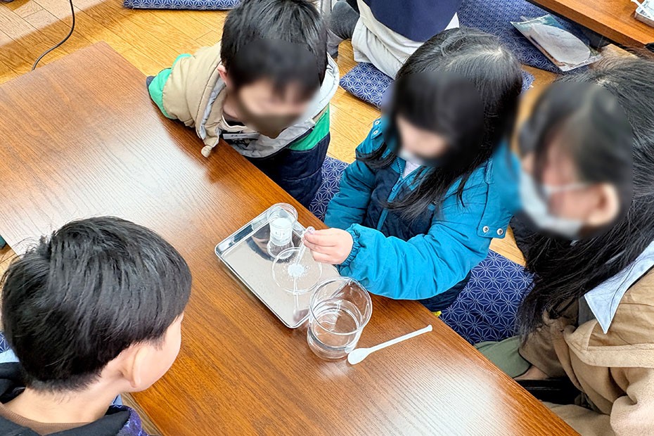 アミノ酸の手形実験では、こどもたちはきれいな手形を浮き上がらせるために何度も試行錯誤する姿が見られました。また、吸水ポリマーの実験では、予想以上に大量の水を吸収する様子や、塩を加えると水が出てくる仕組みに驚きの声が上がっていました。