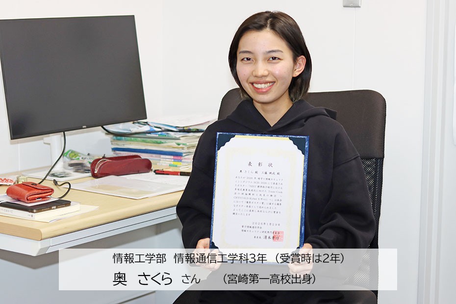 1月26日(月)~30日(金)に、北海道の函館アリーナにて開催された「2026年暗号と情報セキュリティシンポジウム」(主催:電子情報通信学会・情報セキュリティ研究専門委員会)において、情報工学部情報通信工学科3年(受賞時は2年)の学生のポスター発表が「SCIS2026優秀ポスター賞」を受賞しました。