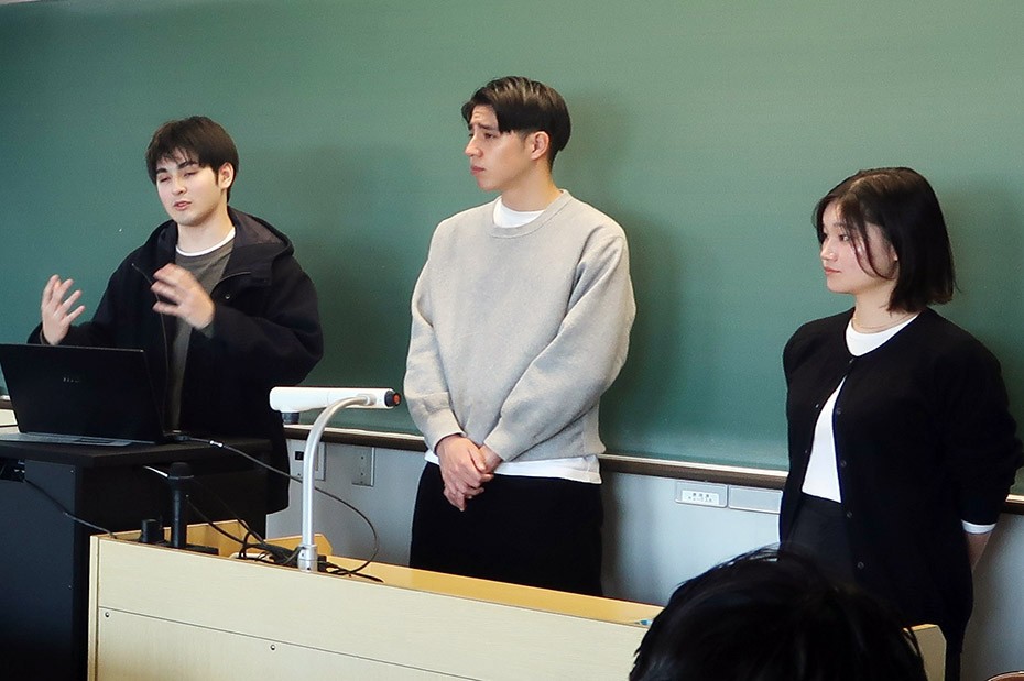2026年1月14日に開催した成果報告会では、福岡県警の交通企画課様、警備課様をお招きして学生の成果報告を聴講いただき、「来場者数が増加傾向にある東区花火大会での人流シミュレーションシステム」と「クイズ形式で楽しく学習して交通事故の減少や安全意識の向上を目指す交通安全クイズアプリ」を発表しました。