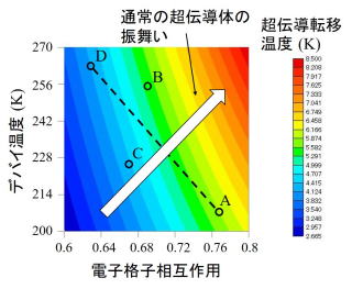 複数の元素を同程度混ぜた高エントロピー状態が超伝導にどのような影響を及ぼすのか明らかではありませんでした。東京都立大学・水口佳一准教授、九州産業大学・西嵜照和教授と共同で、新しい高エントロピー合金超伝導体HfMoNbTiZrを開発しました。さらに、エントロピー状態を揃えたうえで、いろいろな高エントロピー合金超伝導体を比較したところ、高エントロピー状態では、量子力学の基本原理である不確定性原理を通して、格子振動が激しくなるほど超伝導になる温度が低くなることを発見しました。不確定性原理が機能性に関わることは、超伝導体以外の高エントロピー合金にも当てはまります。したがって、本研究は、高エントロピー合金が示す様々な実用的機能性を深く理解し、さらに向上させるために役立つと期待されます。下図は、デバイ温度(格子振動の激しさ)と電子格子相互作用(電子と格子振動の接着のしやすさ)に対する超伝導転移温度の等高線プロットです。超伝導を実現するには電気を流す役目の電子がペアを組む必要があります。このとき、格子振動が接着剤の役割を果たします。通常の超伝導体では白矢印のように、格子振動が激しくなると、接着もしやすくなり超伝導転移温度が上昇します。しかし高エントロピー合金超伝導体(A,B,C,D)では、格子振動が激しくなると、原子配列の乱れによる各格子での格子振動のばらつきが大きくなります。すると、不確定性原理から接着に使える時間が短くなりペア形成が困難で、超伝導になる温度が低下します。
