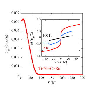 発表論文:"Discovery of ferromagnetism in new multicomponent alloy Ti-Nb-Cr-Ru" APL Materials 10 (2022) 071101.