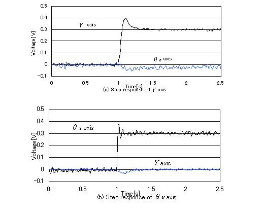 Z軸の制御系には制御周期6.3ms、比例ゲインKP=17.7、微分げインKD=-0.57、積分ゲインKI=0.02を、X、Y軸には制御周期6.3ms、比例ゲインKP=13.2、微分げインKD=-0.53、積分ゲインKI=0.011を、θx、θy軸には制御周期6.3ms、比例ゲインKP=6.6、微分げインKD=-0.11、積分ゲインKI=0.31を用いる。各軸についてステップ応答の測定を行うことにより、PID制御による制御精度と軸間干渉が明らかとなる。