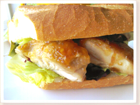 サンドイッチは、照り焼きチキンとサラダをフランスパンで挟みました。
