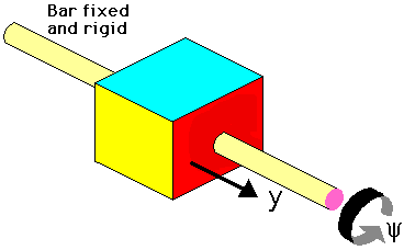 制約条件を付けることによって,剛体の運動に対する自由度の数を減らすことができます 1自由度 先ず始めに,剛体の運動が1自由度になるような制約条件を与えることにします. 図に示しましたように,地球に固定されている棒に剛体を通しますと,剛体はy軸の方向にだけ動くことになります. 棒の断面形状が四角形ですから,y軸の周りには回転しません. このように剛体を取り付けますと,剛体は運動に対して1自由度しか持たないことになります.